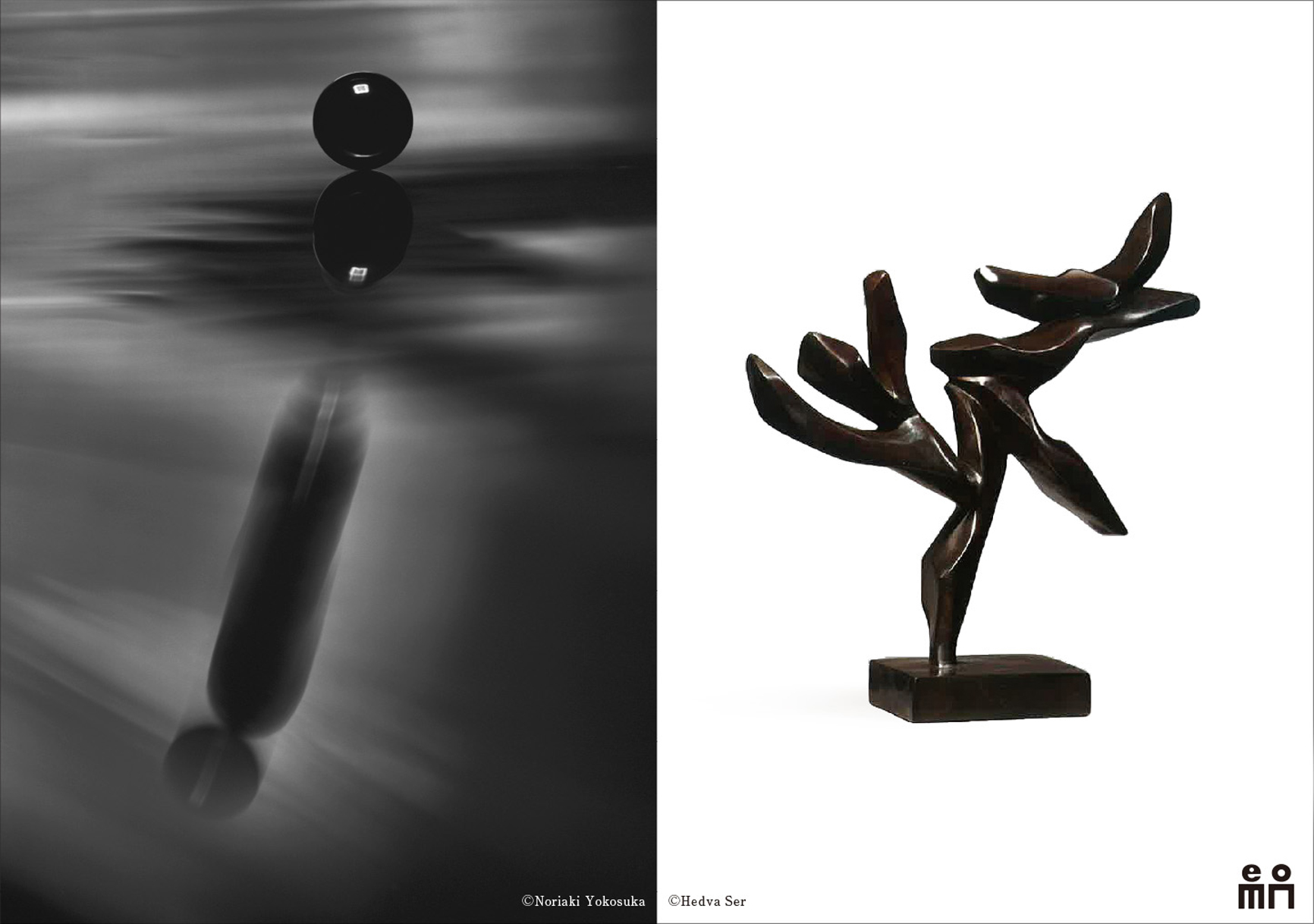 Les photographies abstraites en noir & blanc de Yokosuka naviguent dans la construction de l’espace et mettent l’accent sur le contraste entre l’ombre et la lumière. Le style à la fois épuré et raffiné rejoint l’essence de l’esthétique japonaise. De manière différente mais complémentaire, les sculptures en bronze de Hedva Ser nous embarquent pour un voyage vers une nature aux FORMES courbées : arbre, rocher, vague, tempête, totem et flamme. Ses oeuvres évoquent force et sensibilité, mariant ainsi les concepts asiatiques du yin et du yang.